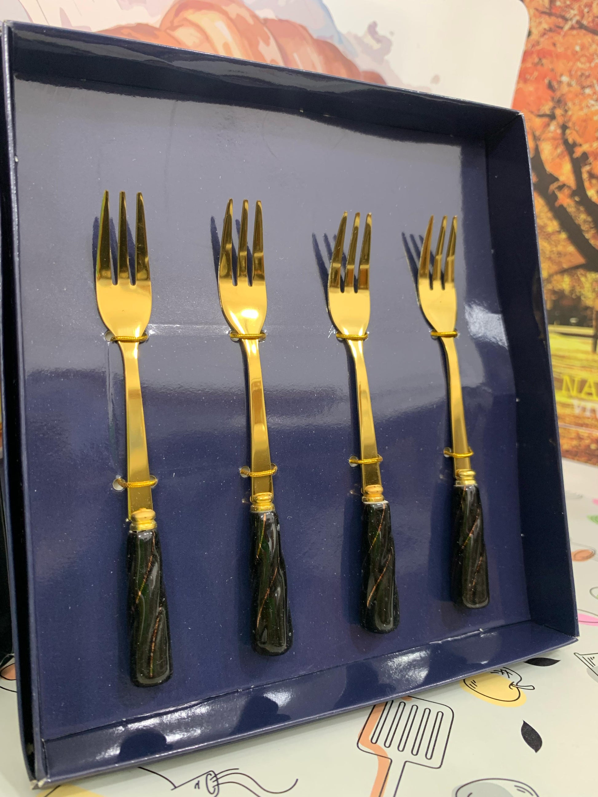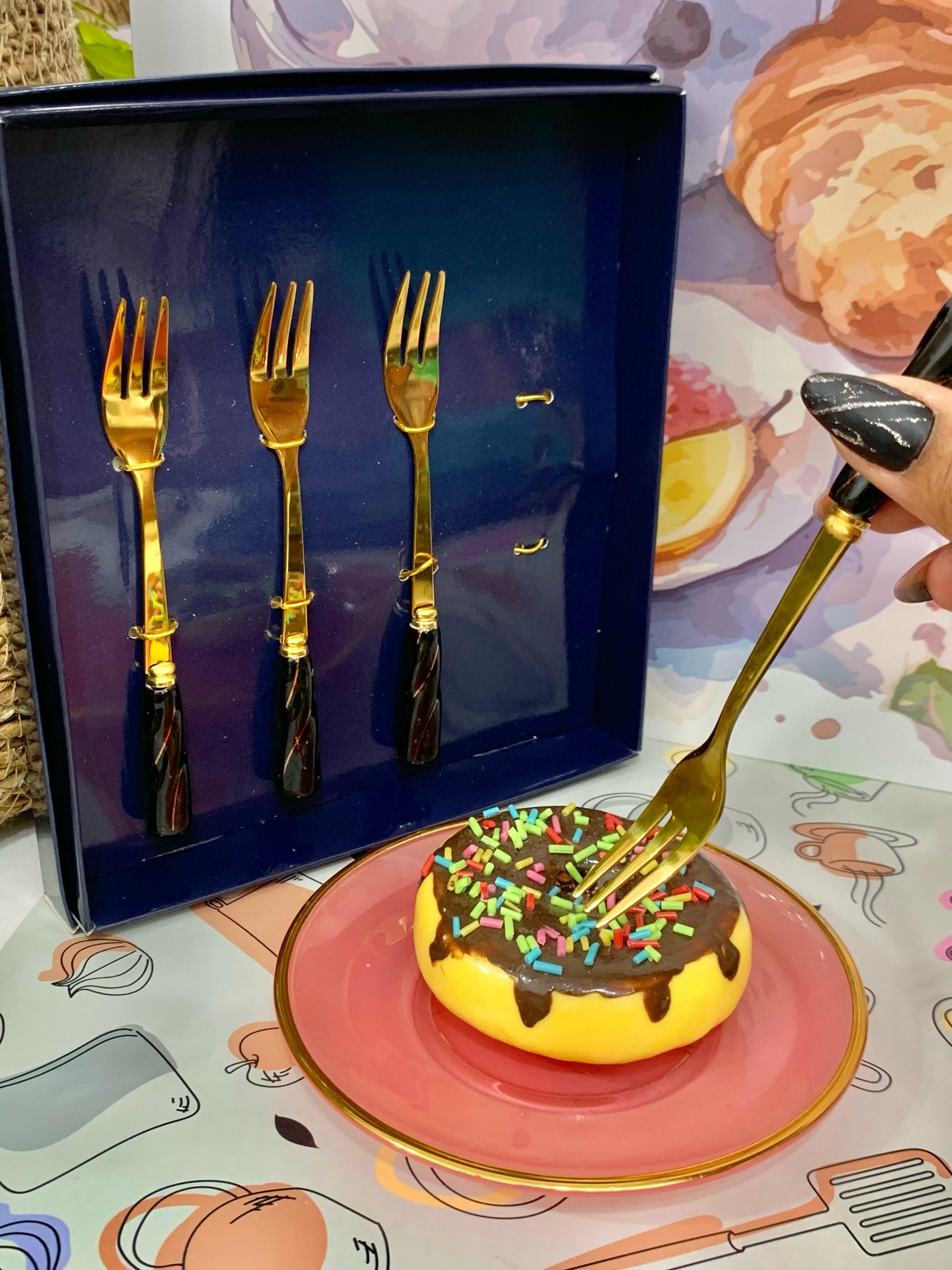 Conjunto 4 Garfos Aço Inox Para Aperitivo Dourado Cabo Cerâmica Preto