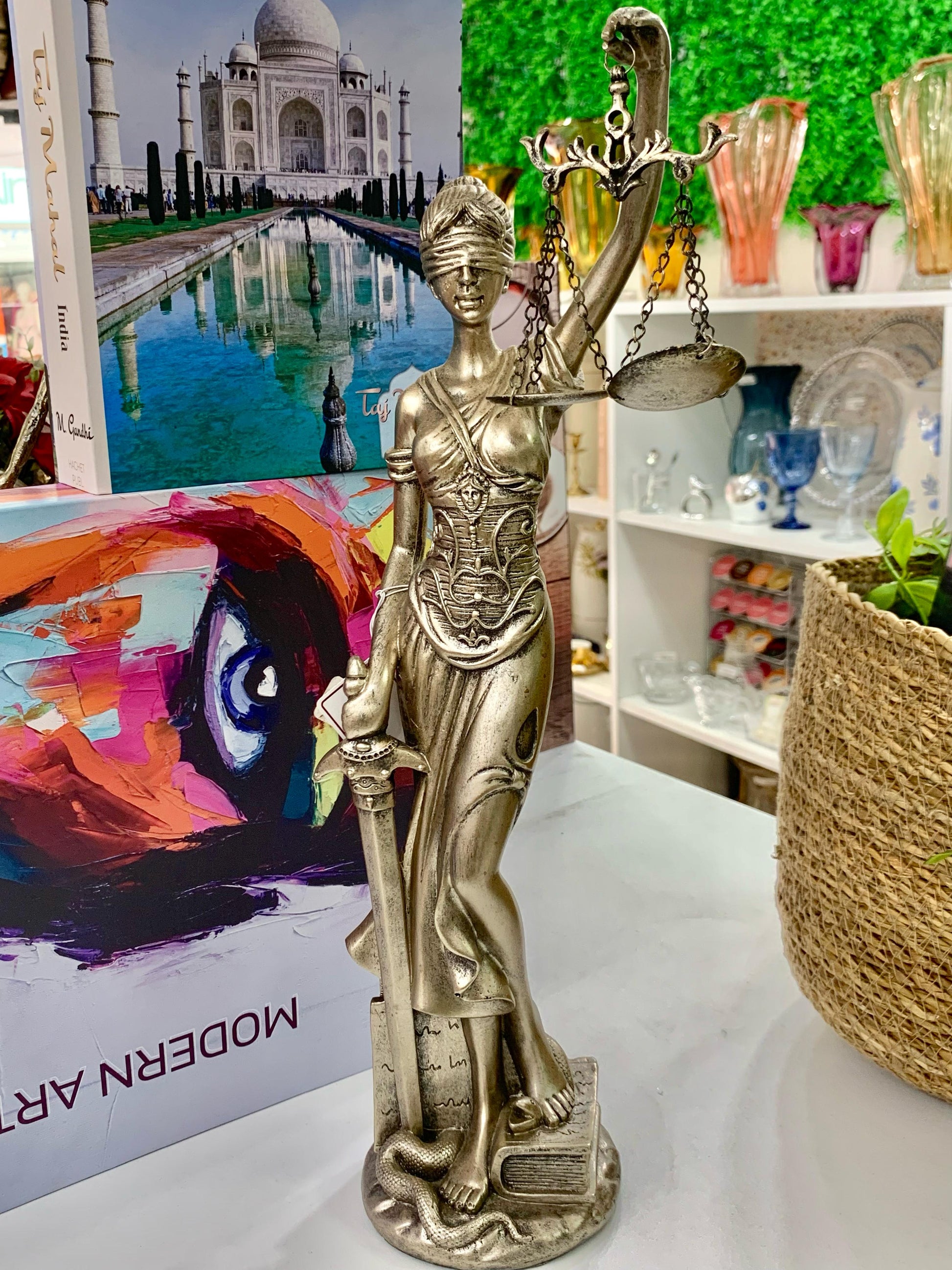 Conhecida como Dama da Justiça, a Deusa Têmis é a divindade da verdade, da ordem, da equidade e da Humanidade, colocada acima das paixões humanas. Uma peça clássica, simbólica e amplamente usada na decoração de salas e escritórios. 13x12x42cm