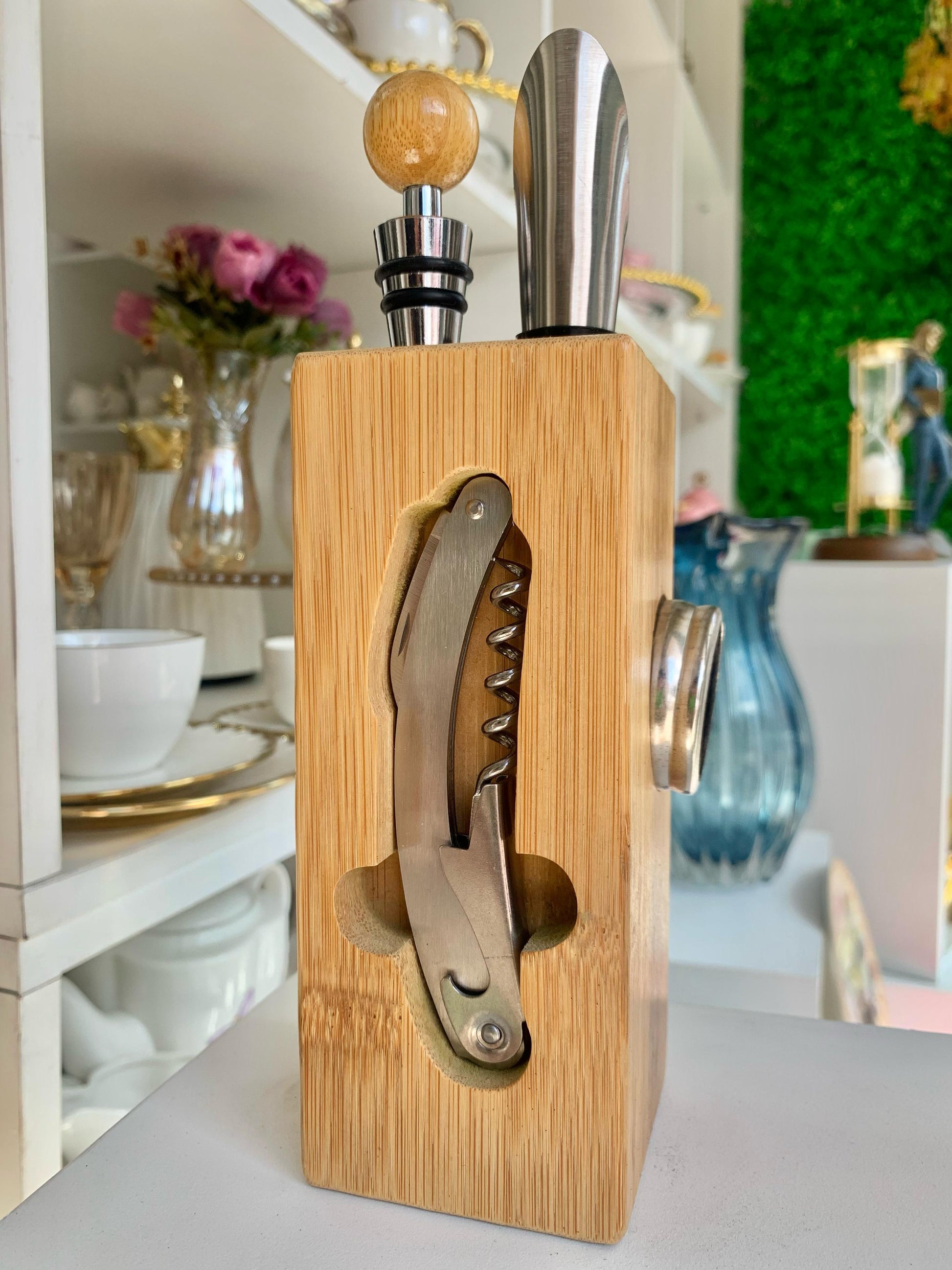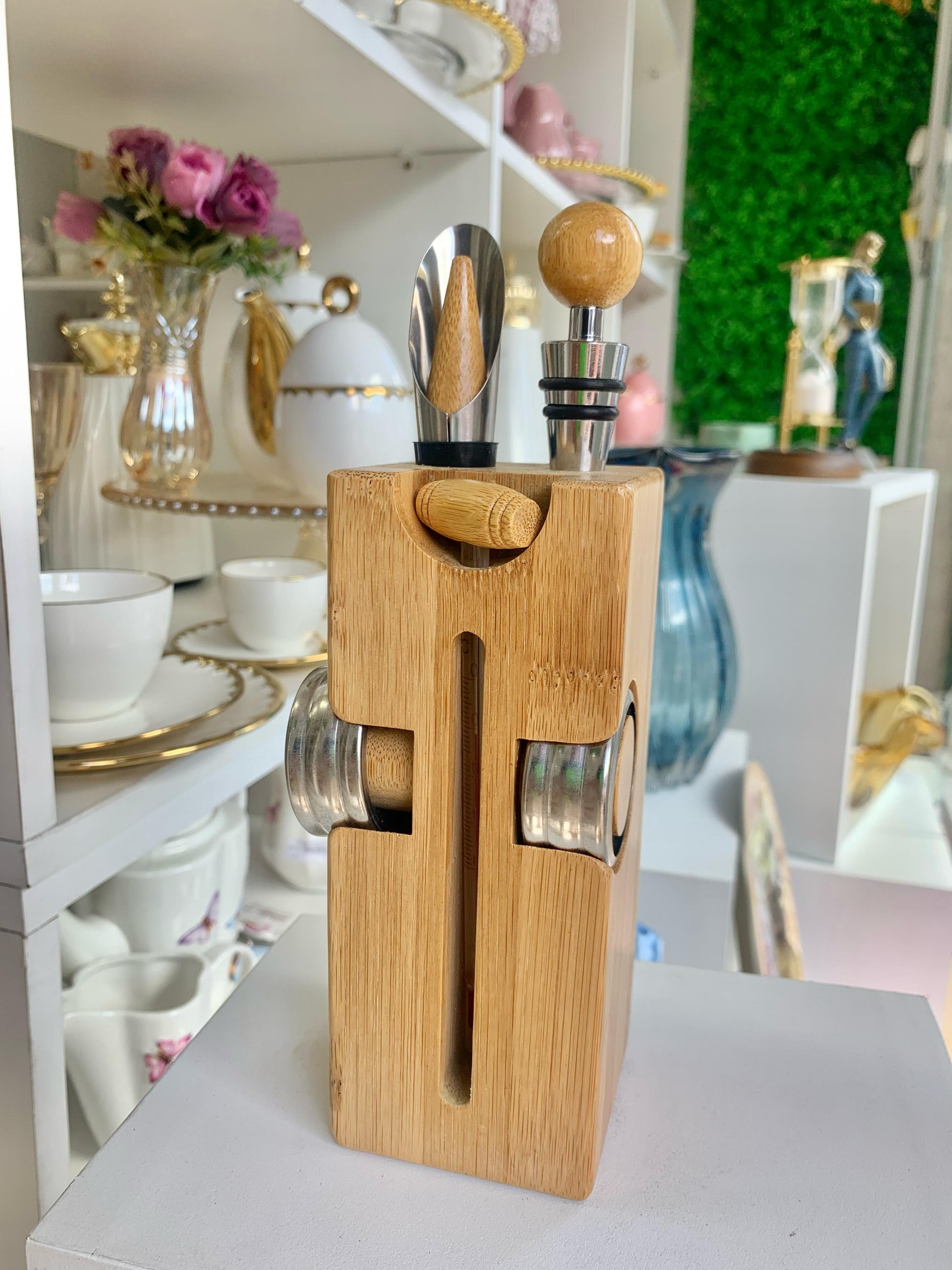 KIT PARA VINHO 6 PEÇAS COM SUPORTE EM BAMBU