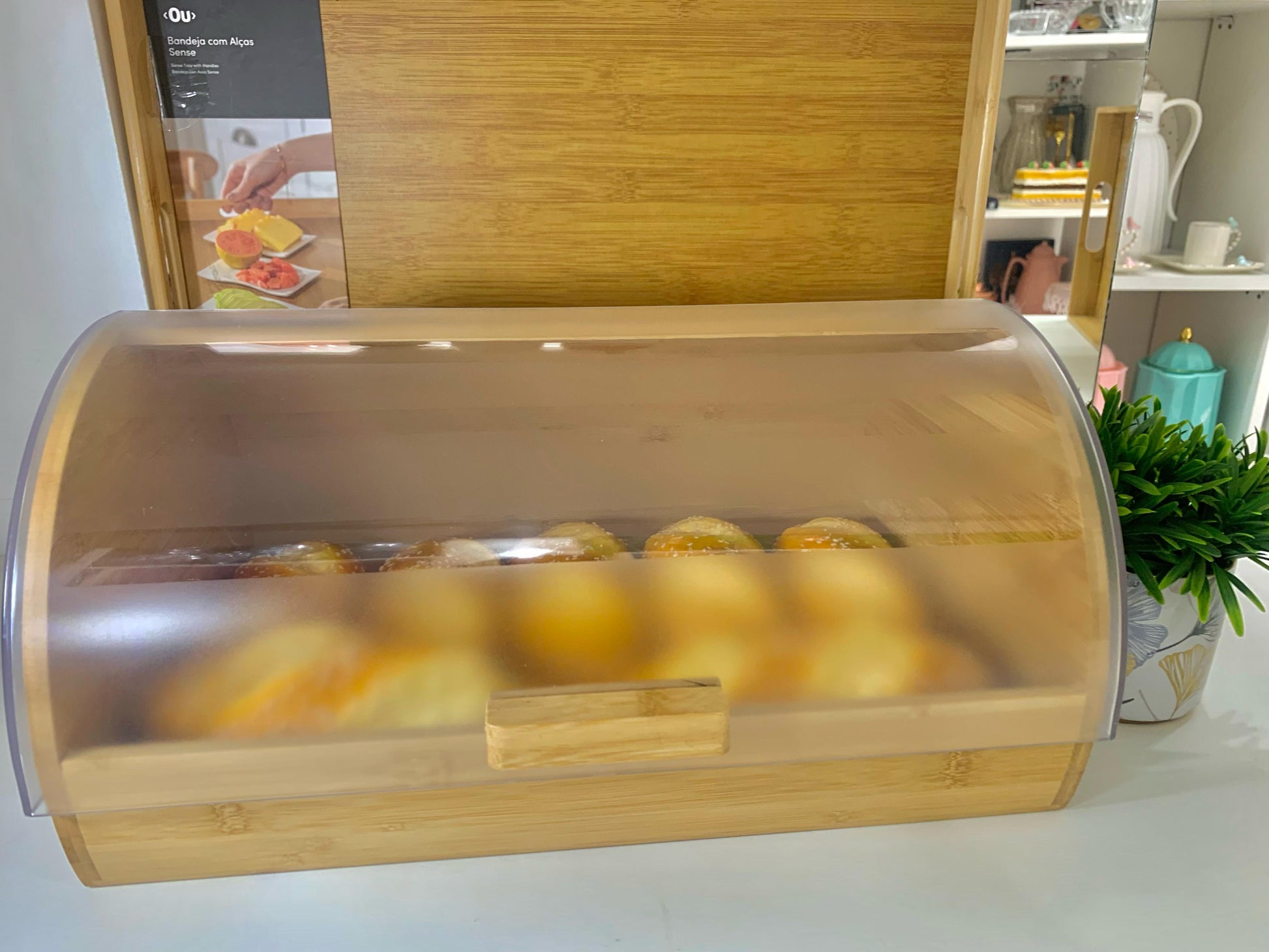 Mantenha seu pão fresquinho e estiloso com nosso Porta Pão de Bambu com Abertura em Acrílico.