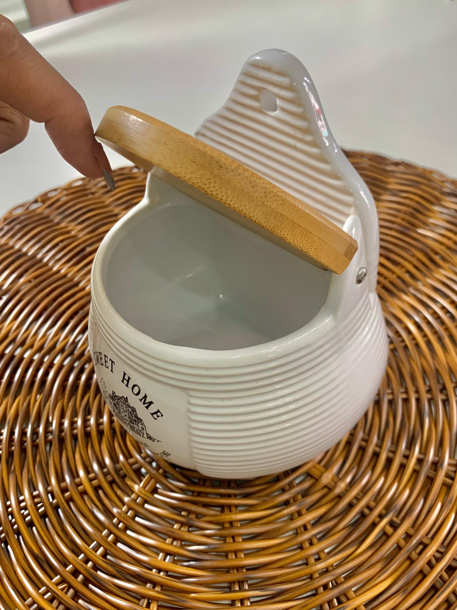Saleiro De Parede Cerâmica Sweet Home Tampa De Madeira Lyor Cor Branco