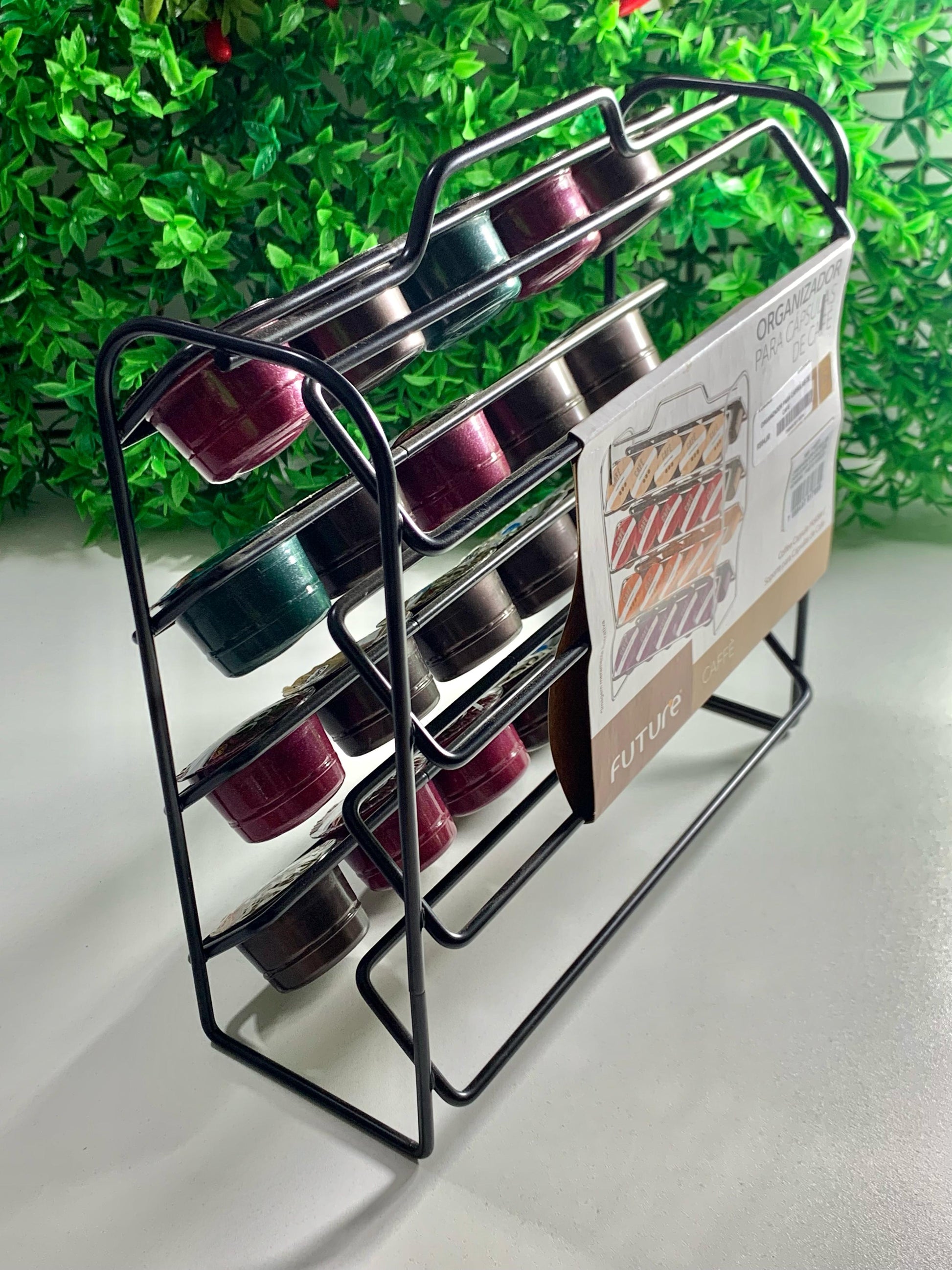 O Suporte Porta 40 Cápsulas Café Três Corações Luxo Expresso da marca FUTURE é a solução perfeita para organizar suas cápsulas de café de forma prática e elegante. Com um design moderno na cor preta, este suporte possui altura, comprimento e largura de 24 cm, sendo feito em aço resistente.